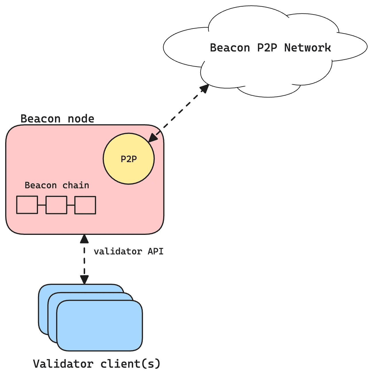 A validator client is the piece of software that executes these responsibilities for each of its registered validator keys (which can be many). But a validator client on its own cannot connect to the P2P beacon network to talk directly to other validators. Instead, it connects to an entity known as a beacon node, which is a standalone client that maintains the beacon chain and communicates with other beacon nodes.